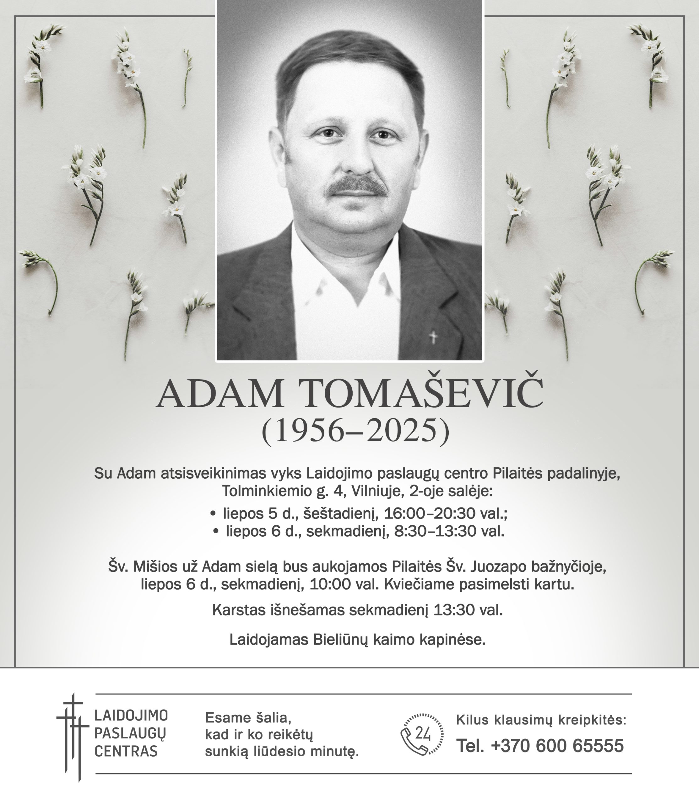 Su Adam atsisveikinimas vyks Laidojimo paslaugų centro Pilaitės padalinyje, Tolminkiemio g. 4, Vilniuje, 2-oje salėje: