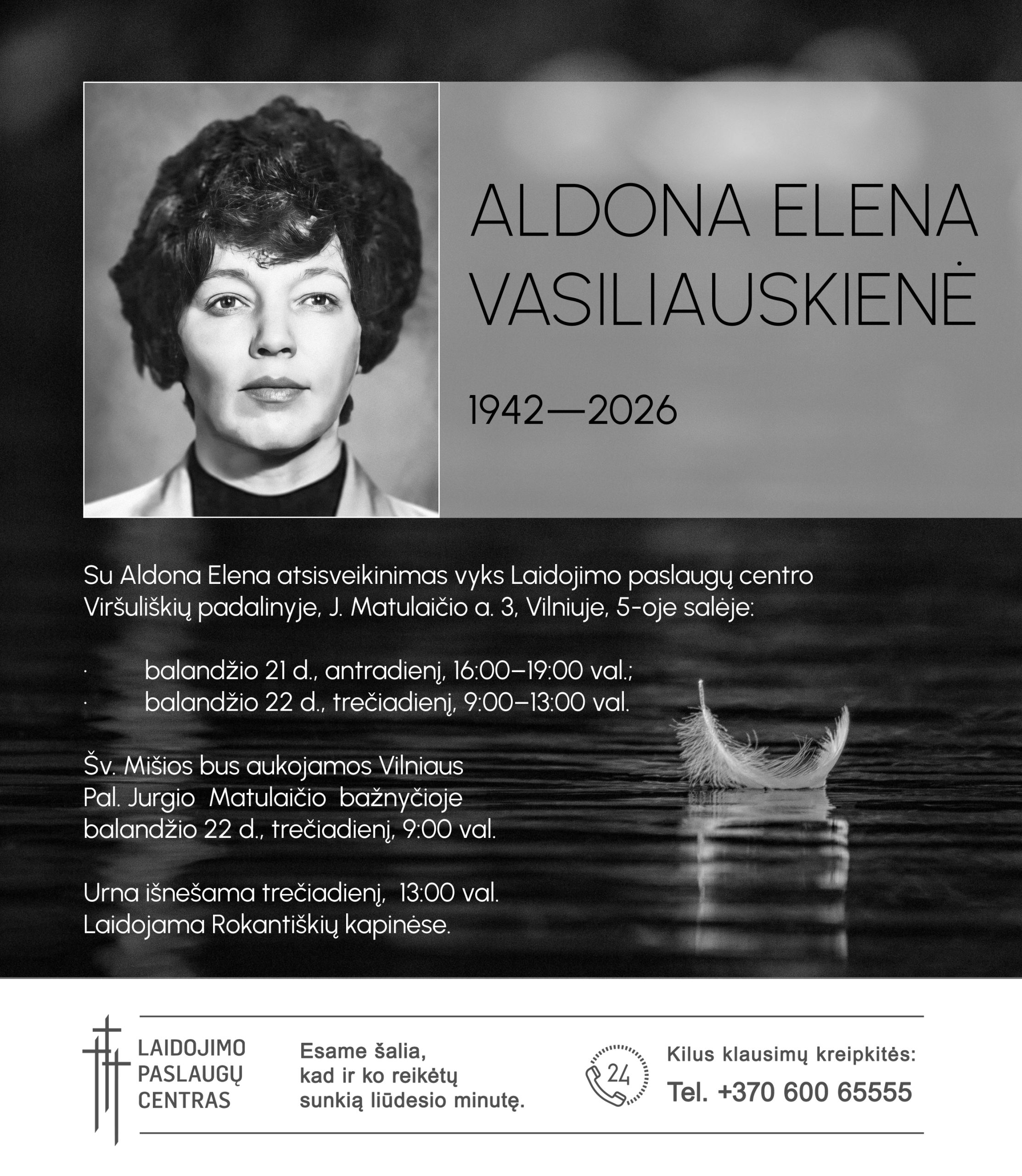 Su Aldona Elena atsisveikinimas vyks Laidojimo paslaugų centro Viršuliškių padalinyje, J. Matulaičio a. 3, Vilniuje, 5-oje salėje: