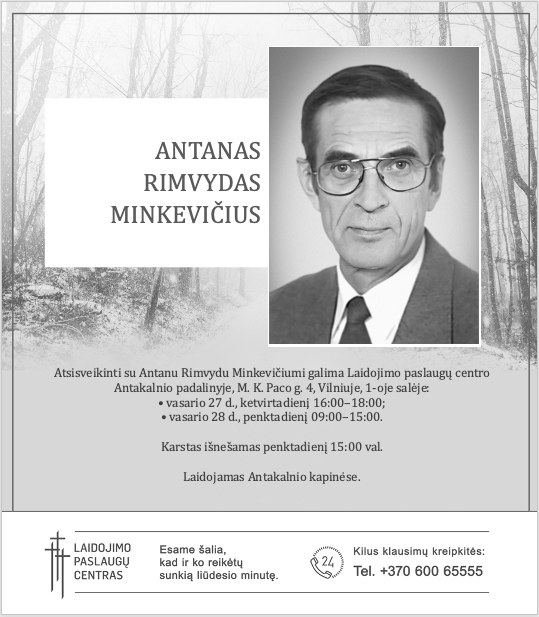 Atsisveikinti su Antanu Rimvydu Minkevičiumi galima Laidojimo paslaugų centro Antakalnio padalinyje, M. K. Paco g. 4, Vilniuje, 1-oje salėje: