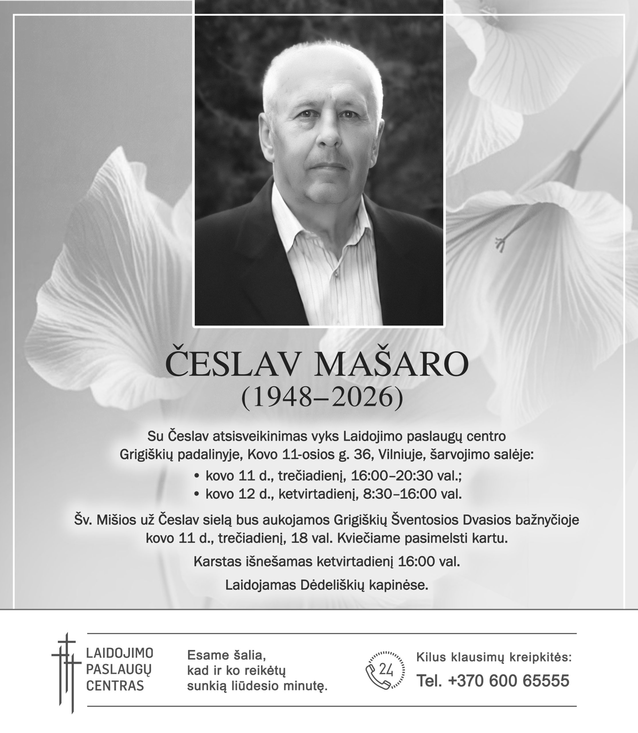 Su liūdesiu pranešame, kad amžinojo poilsio iškeliavo ČESLAV MAŠARO (1948.06.16–2026.03.10).