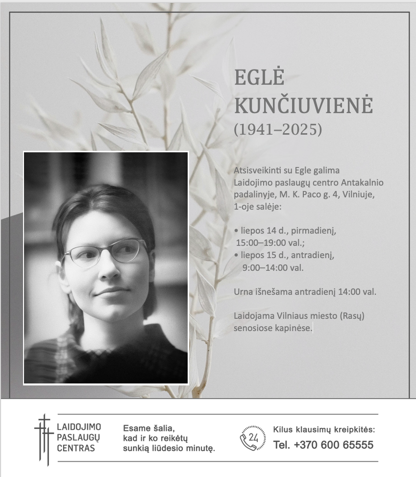 Su giliausiu liūdesiu pranešame, kad netekome EGLĖS KUNČIUVIENĖS (1941.12.20–2025.07.13).