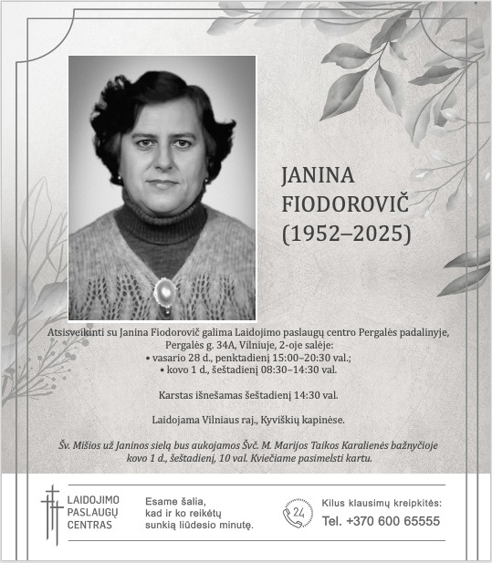 Atsisveikinti su Janina Fiodorovič galima Laidojimo paslaugų centro Pergalės padalinyje, Pergalės g. 34A, Vilniuje, 2-oje salėje: