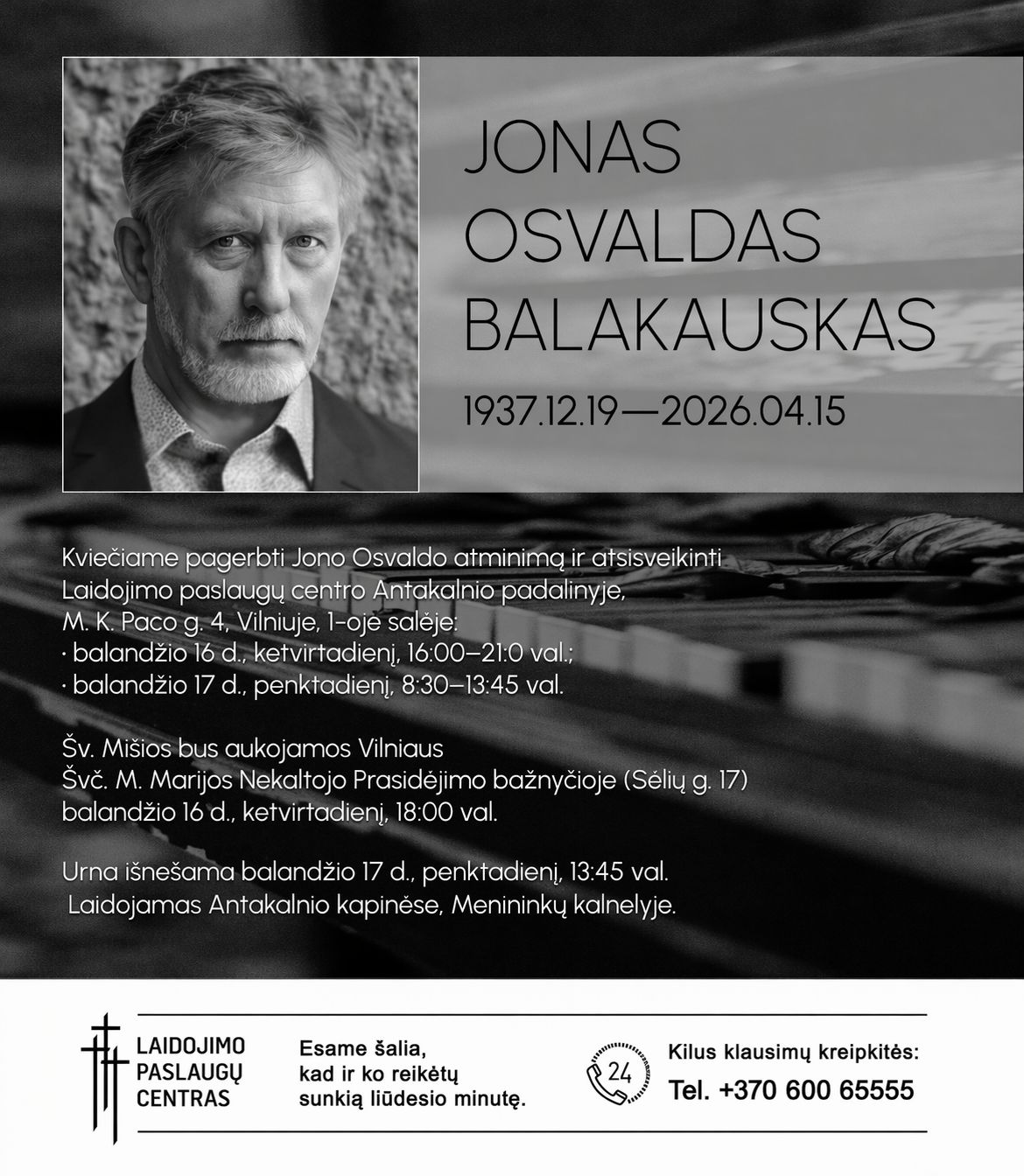 Kviečiame pagerbti Jono Osvaldo atminimą ir atsisveikinti Laidojimo paslaugų centro Antakalnio padalinyje, M. K. Paco g. 4, Vilniuje, 1-oje salėje: