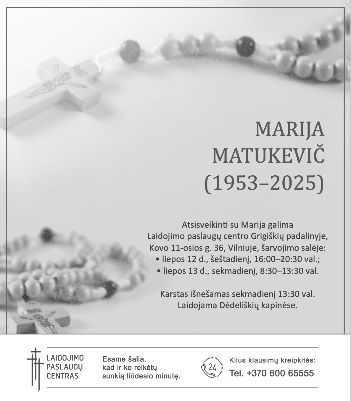 Su Marija atsisveikinimas vyks Laidojimo paslaugų centro Grigiškių padalinyje, Kovo 11-osios g. 36, Vilniuje, šarvojimo salėje: