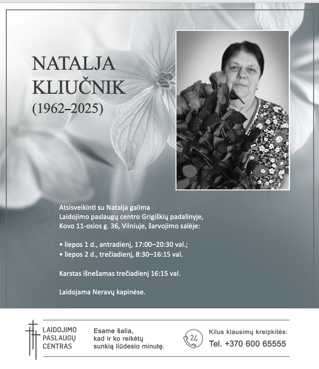 Liūdna širdimi pranešame, kad šį pasaulį paliko NATALJA KLIUČNIK (1962.04.05–2025.06.30).