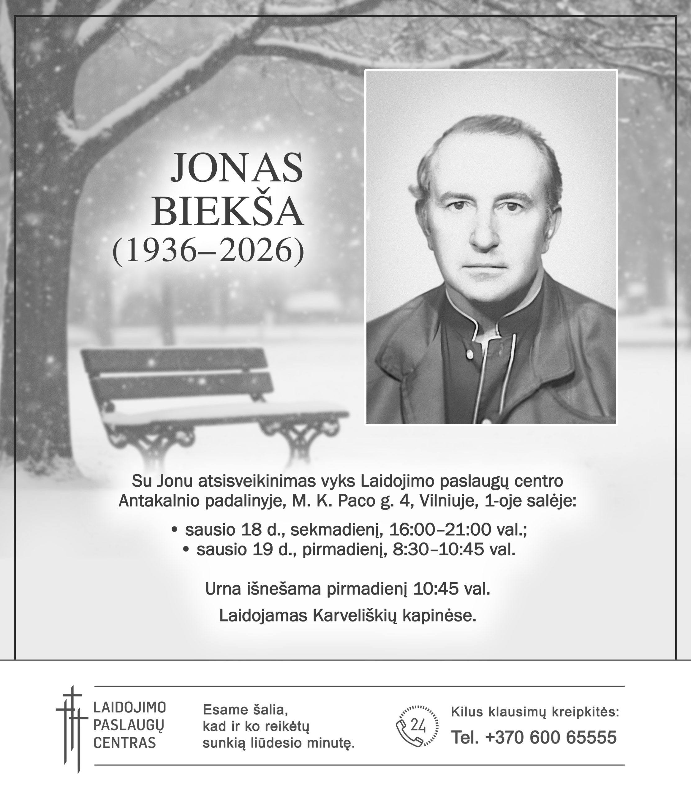 Liūdna širdimi pranešame, kad šį pasaulį paliko JONAS BIEKŠA (1936.02.21–2026.01.16).