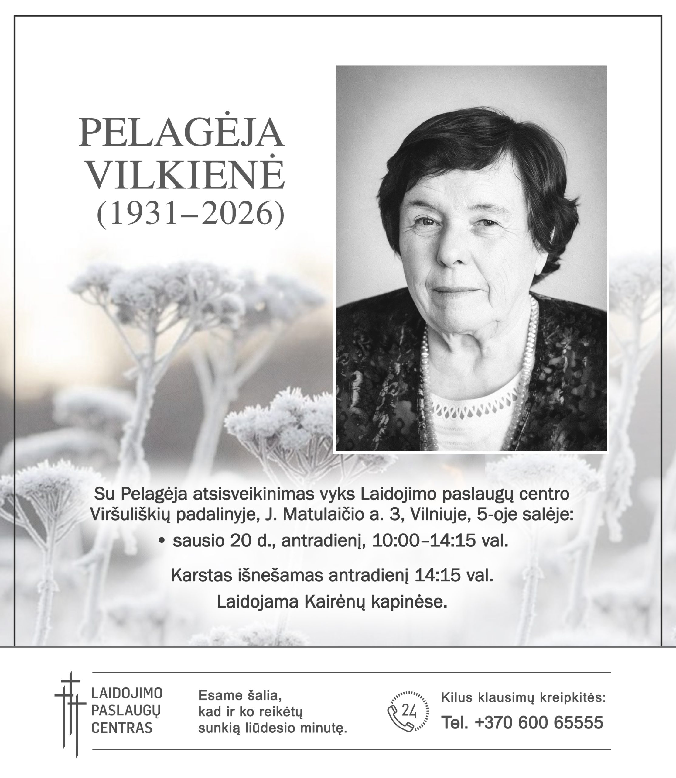 Su Pelagėja atsisveikinimas vyks Laidojimo paslaugų centro Viršuliškių padalinyje, J. Matulaičio a. 3, Vilniuje, 5-oje salėje: