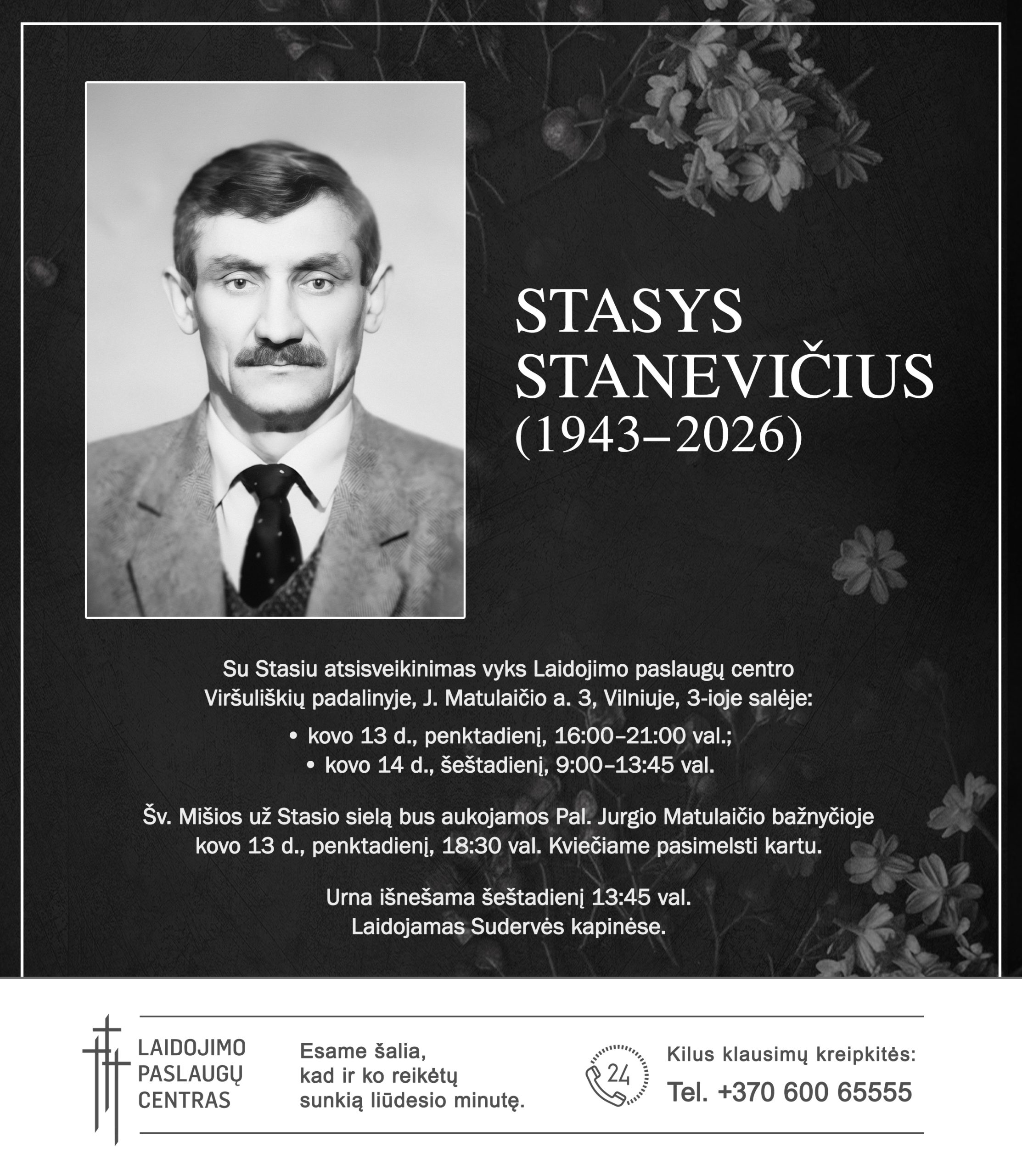 Su Stasiu atsisveikinimas vyks Laidojimo paslaugų centro Viršuliškių padalinyje, J. Matulaičio a. 3, Vilniuje, 3-ioje salėje: