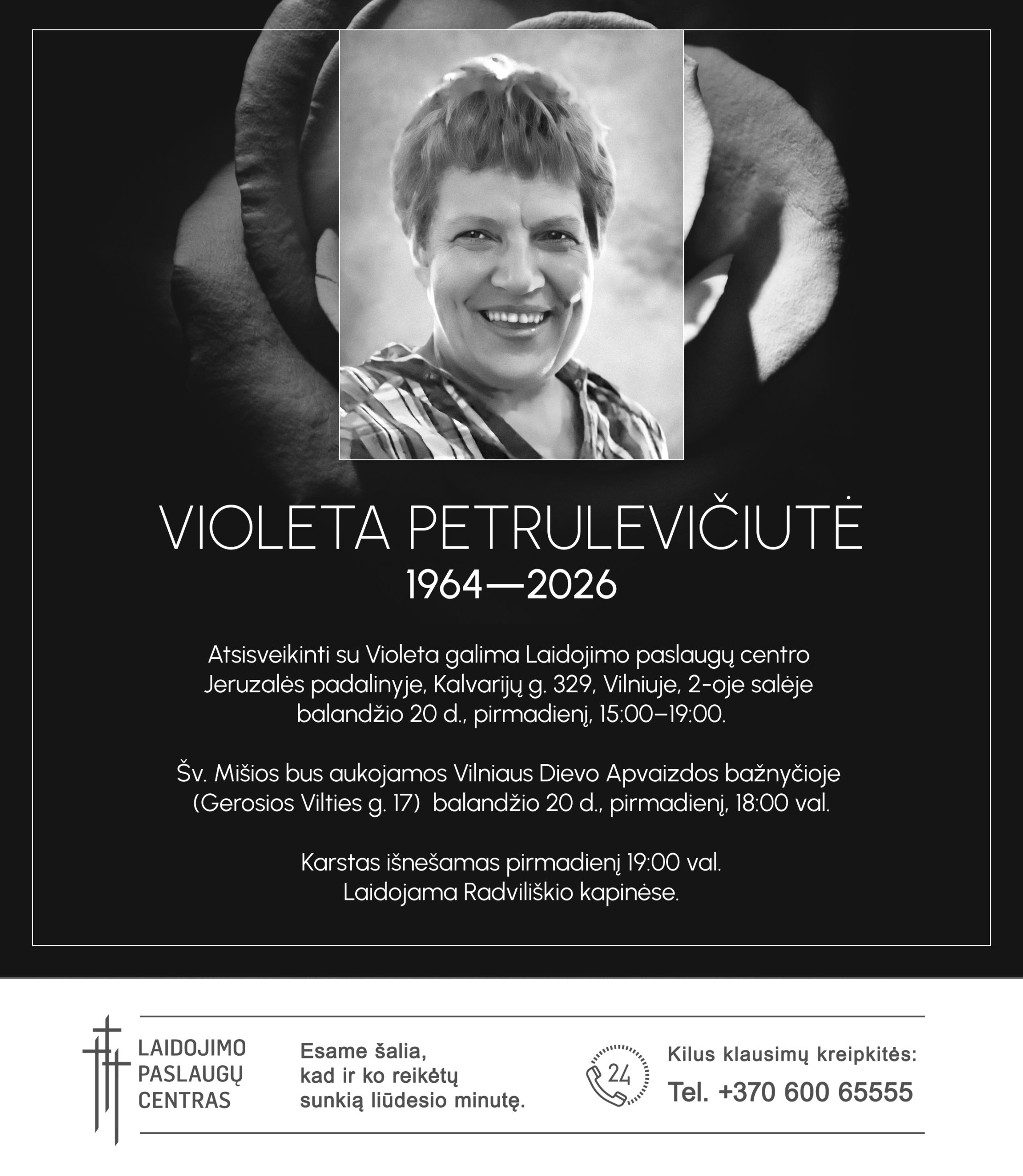 Atsisveikinti su Violeta galima Laidojimo paslaugų centro Jeruzalės padalinyje, Kalvarijų g. 329, Vilniuje, 2-oje salėje balandžio 20 d., pirmadienį, 15:00–19:00.