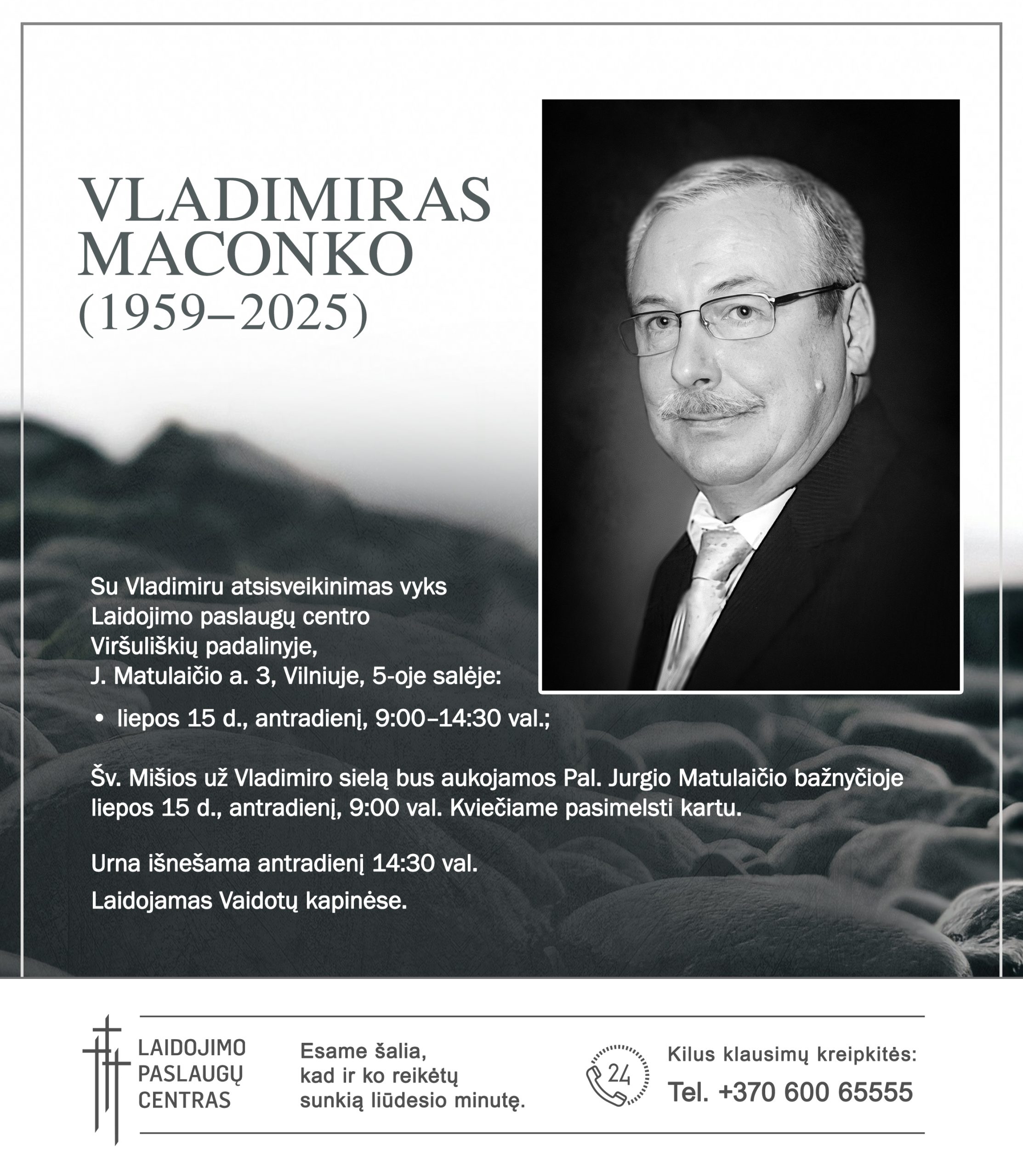 Su Vladimiru atsisveikinimas vyks Laidojimo paslaugų centro Viršuliškių padalinyje, J. Matulaičio a. 3, Vilniuje, 5-oje salėje: