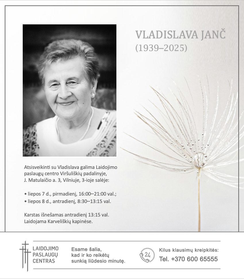 Su giliausiu liūdesiu pranešame, kad netekome VLADISLAVOS JANČ (1939.04.14–2025.07.05).