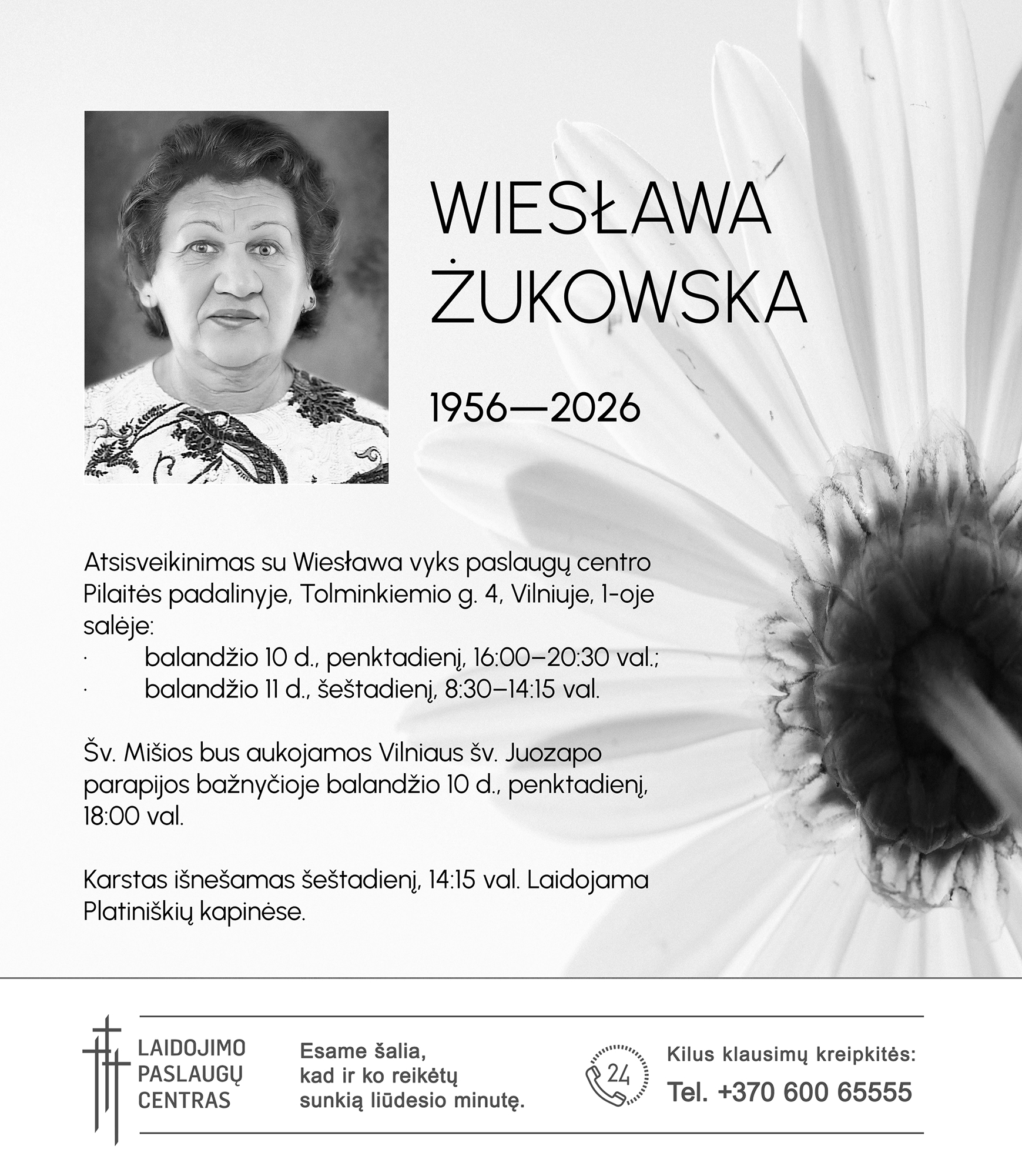Atsisveikinimas su Wiesława vyks Laidojimo paslaugų centro Pilaitės padalinyje, Tolminkiemio g. 4, Vilniuje, 1-oje salėje: